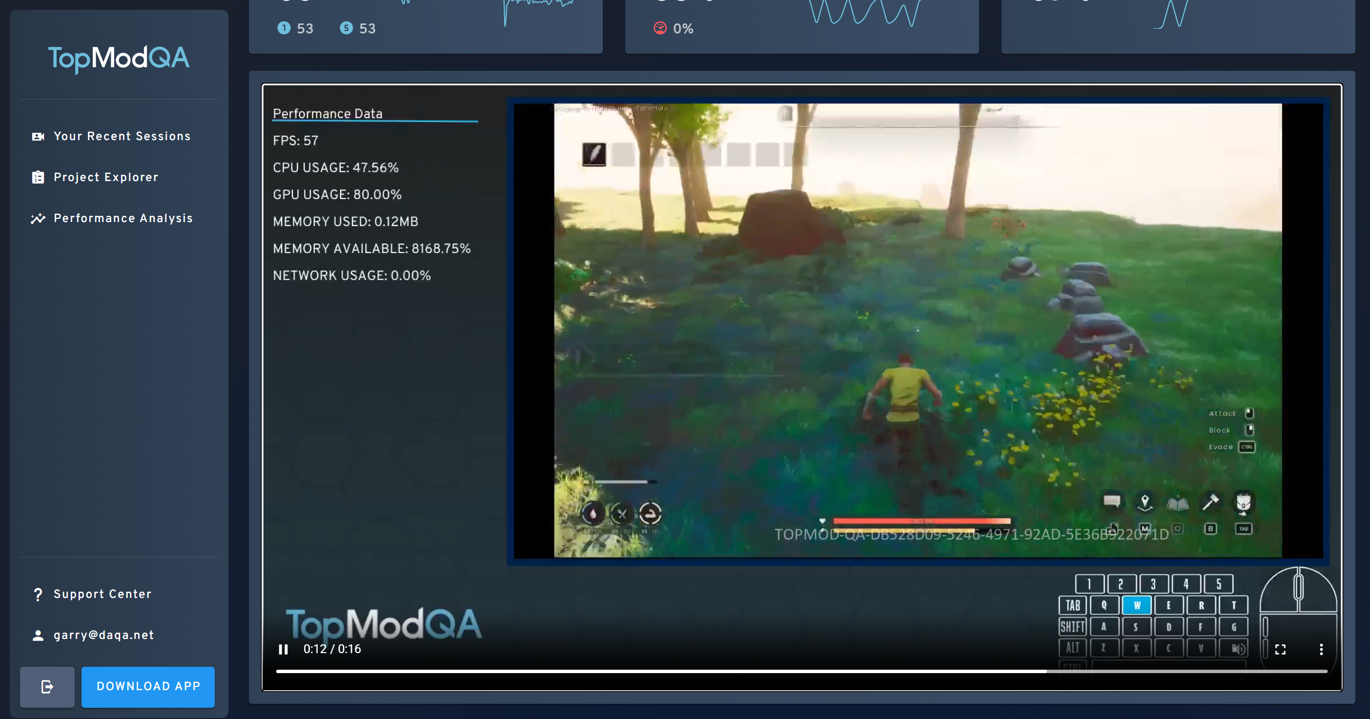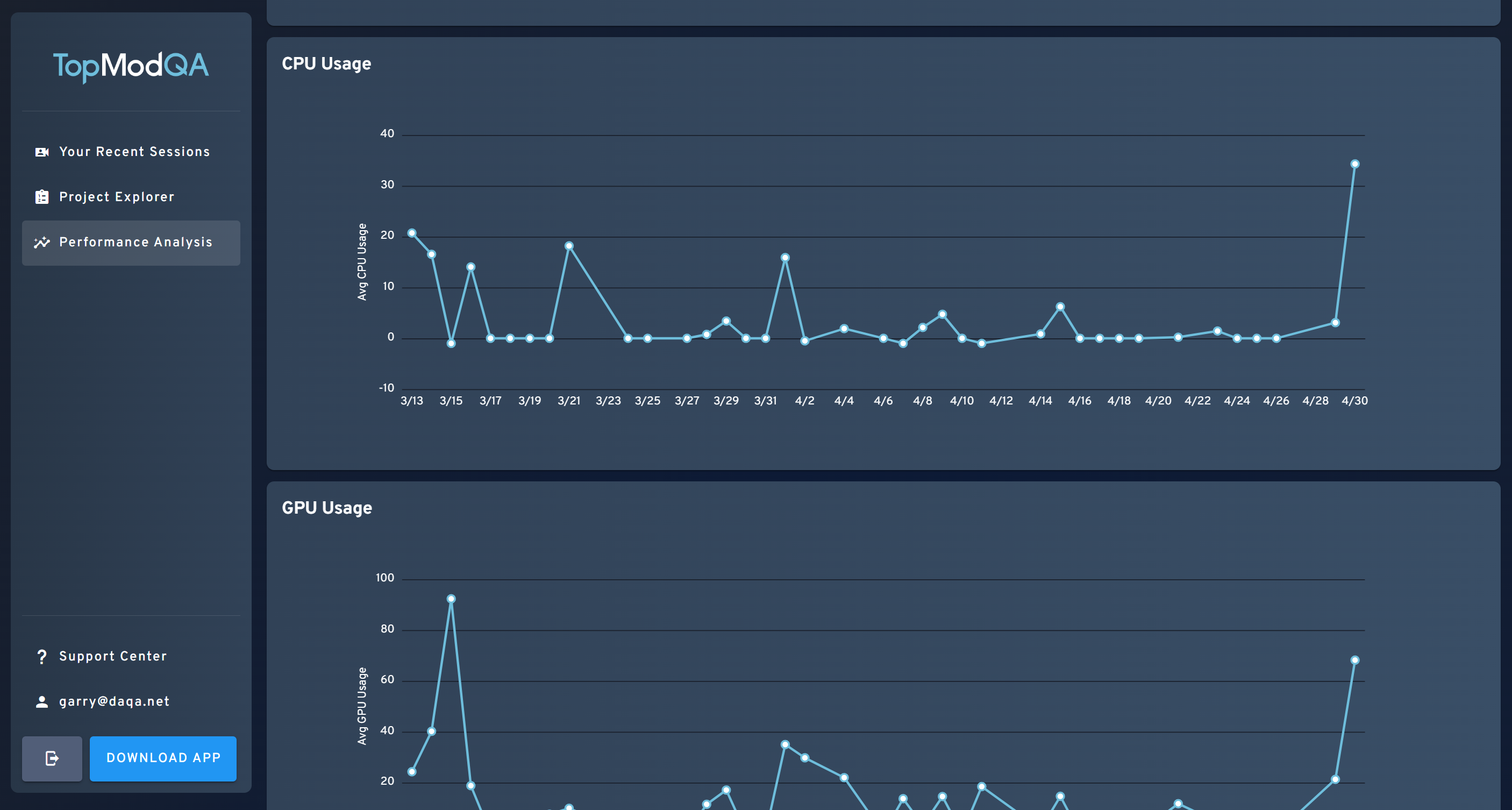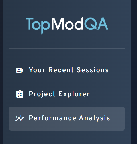Finally, as all Sessions captured within TopMod QA can have Performance Data included as part of the recording, this can be mapped over time to allow you to find any specific issues with any game you are testing. To review this data, click on the "Performance Analysis" menu option in the left-hand sidebar.
